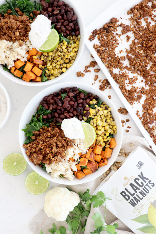 Because black walnuts pack so much protein, they are a great plant-based protein staple and meat alternative! Healthy Grocery Girl loves making a seasoned walnut crumble for tacos, burritos or in spaghetti sauce… the ideas are endless! Here’s a really delicious Black Walnut Burrito Bowl recipe from Healthy Grocery Girl and how you make it.